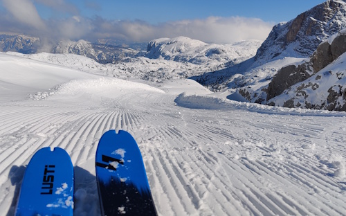 1. den - Příjezd na parkoviště, zakoupení jízdenky na lanovku, sjezd z Krippensteinu na Gjajdalm s možností osvěžní. Tady nasadíme pásy a jdeme cca 6km se stoupáním 400m na chatu.